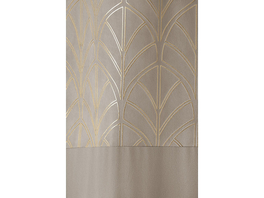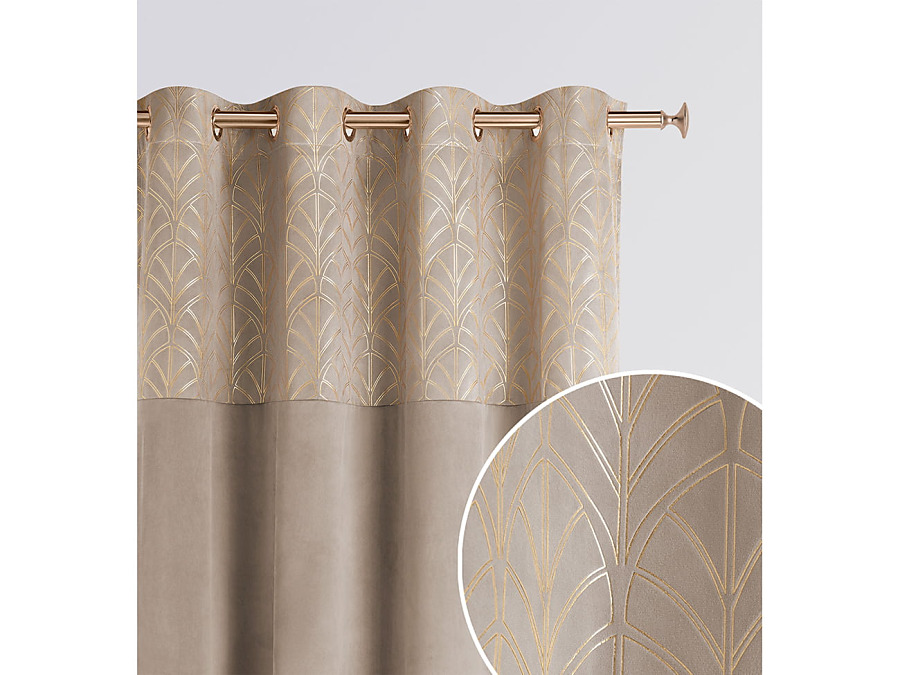 Elegantný hotový záves Bliss v béžovej farbe so zlatým ornamentom v hornej časti závesu. Má matný povrch, je vyrobený z polyesterového zamatu.