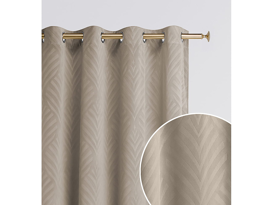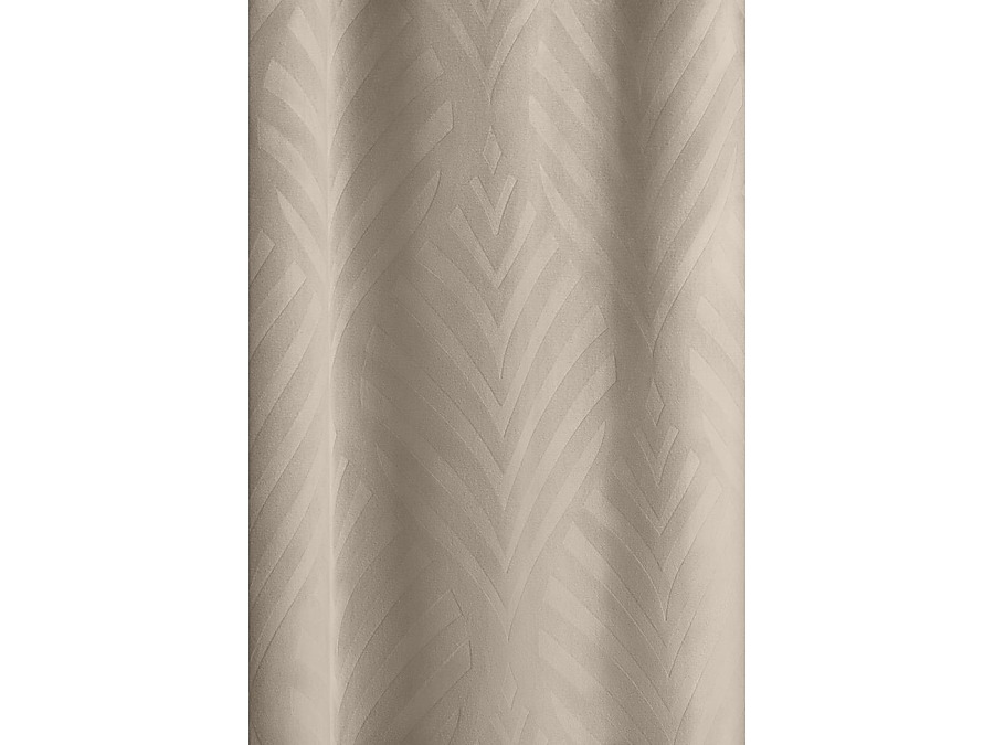 Béžový zamatový záves Leafly. Jednofarebný záves je dekorovaný vzorom listov. Interiér vďaka nemu pôsobí útulnejšie.